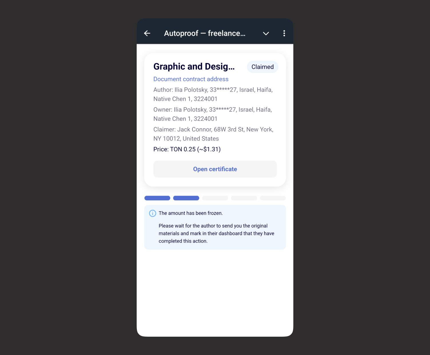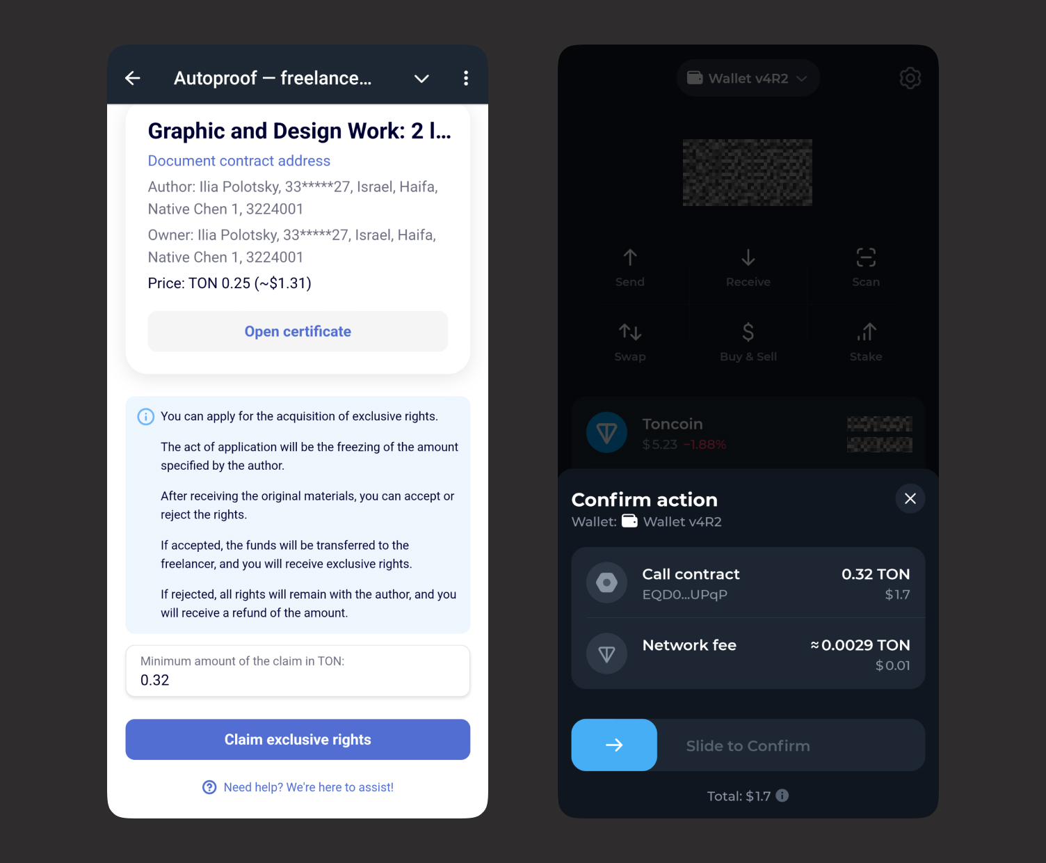 Congratulations! You have been granted exclusive rights to the digital asset and its source files. All relevant data will be stored on the TON blockchain and can be verified by a legally recognized certificate in most countries.